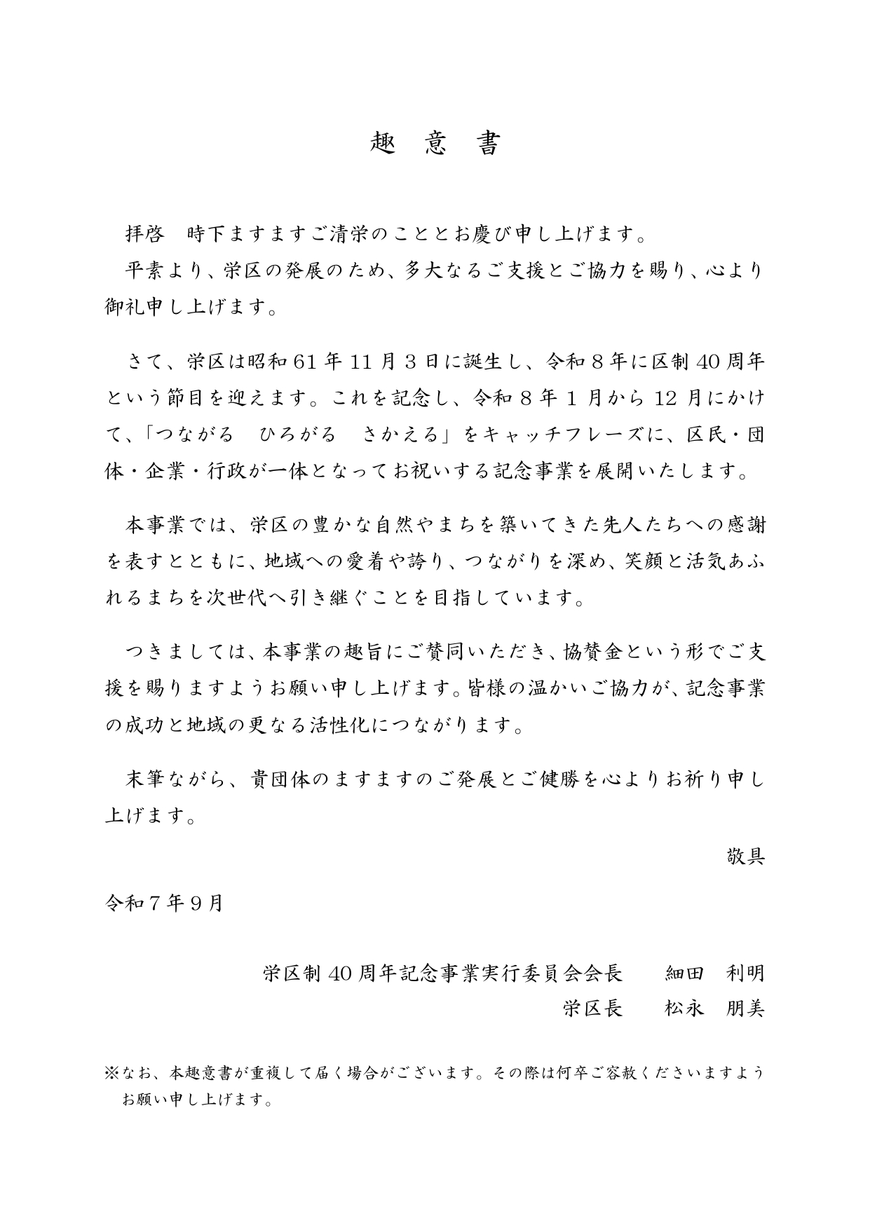 令和8年、栄区制40周年の節目を記念し「つながる ひろがる さかえる」をキャッチフレーズに区民・団体・企業・行政が一体となってお祝いをする記念事業が展開されます。事業実行委員会会長および栄区長より、当協会宛に「栄区制40周年推進事業」に関する協賛金のご依頼がございました。